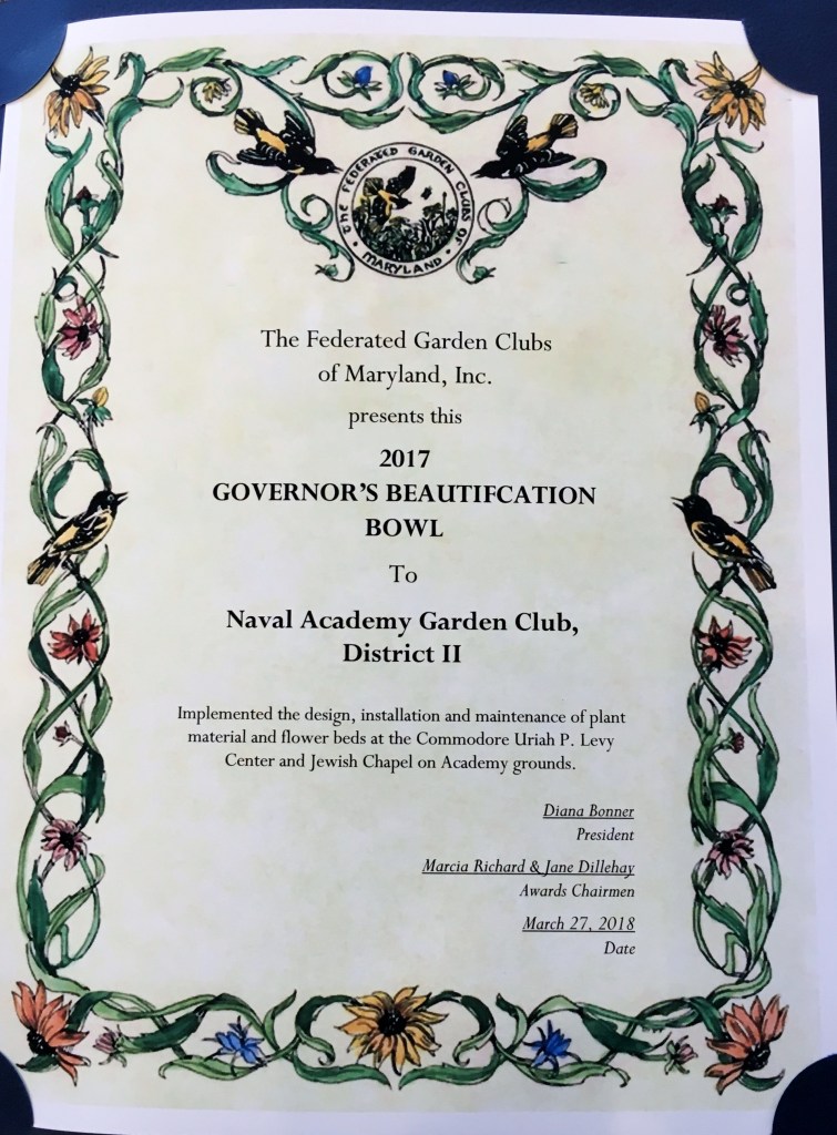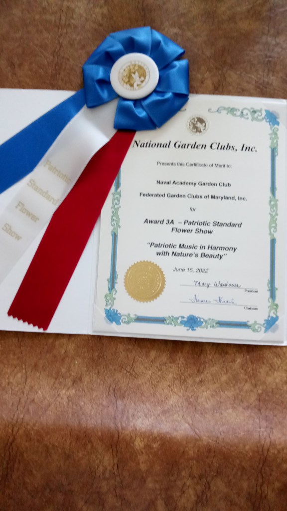 2023: Special recognition: Certificate of Merit from the National Garden Clubs, Inc. for our Flower Show: Patriotic Music in Harmony with Nature’s Beauty. One of 4 clubs in the country to receive this award. The show schedule received the OVERALL WINNER certificate from the Central Atlantic Region of the State Garden Clubs. Also received awards for Community Service and Yearbook.